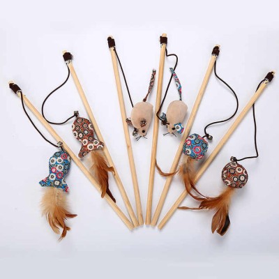 Natural Wooden Mouse Plush Pet Cat Teaser Interactive Feather Stick Toys Cats Teaser Stick Wand Cat Feather Toy
